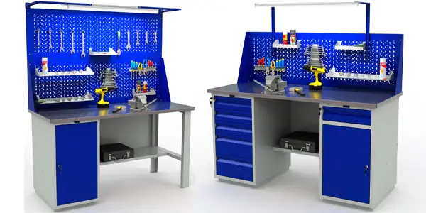 Слесарные верстаки Profi W предназначены для производств, мастерских, гаражей, учебных заведений. Столешница из МДФ 24 мм + оцинкованого листа металла 1,2 мм. Вам доступны 3 вида тумб на выбор: WD-1 (1 дверца), WD-2 (дверца и ящик), WD-5 (5 ящиков). Ключевые замки в комплекте. Нагрузка на верстак: от 350 до 1000 кг. Цвета отделки: серый RAL 7038 и синий RAL 5002.